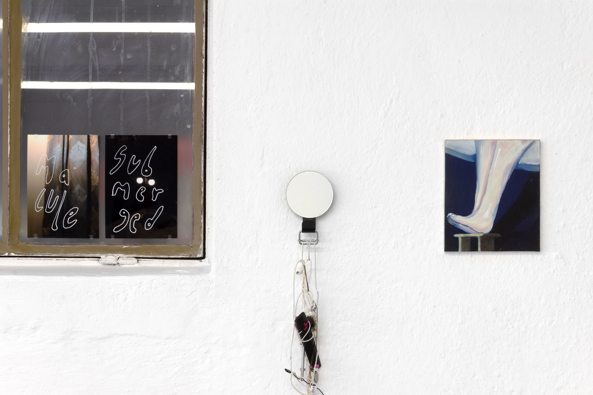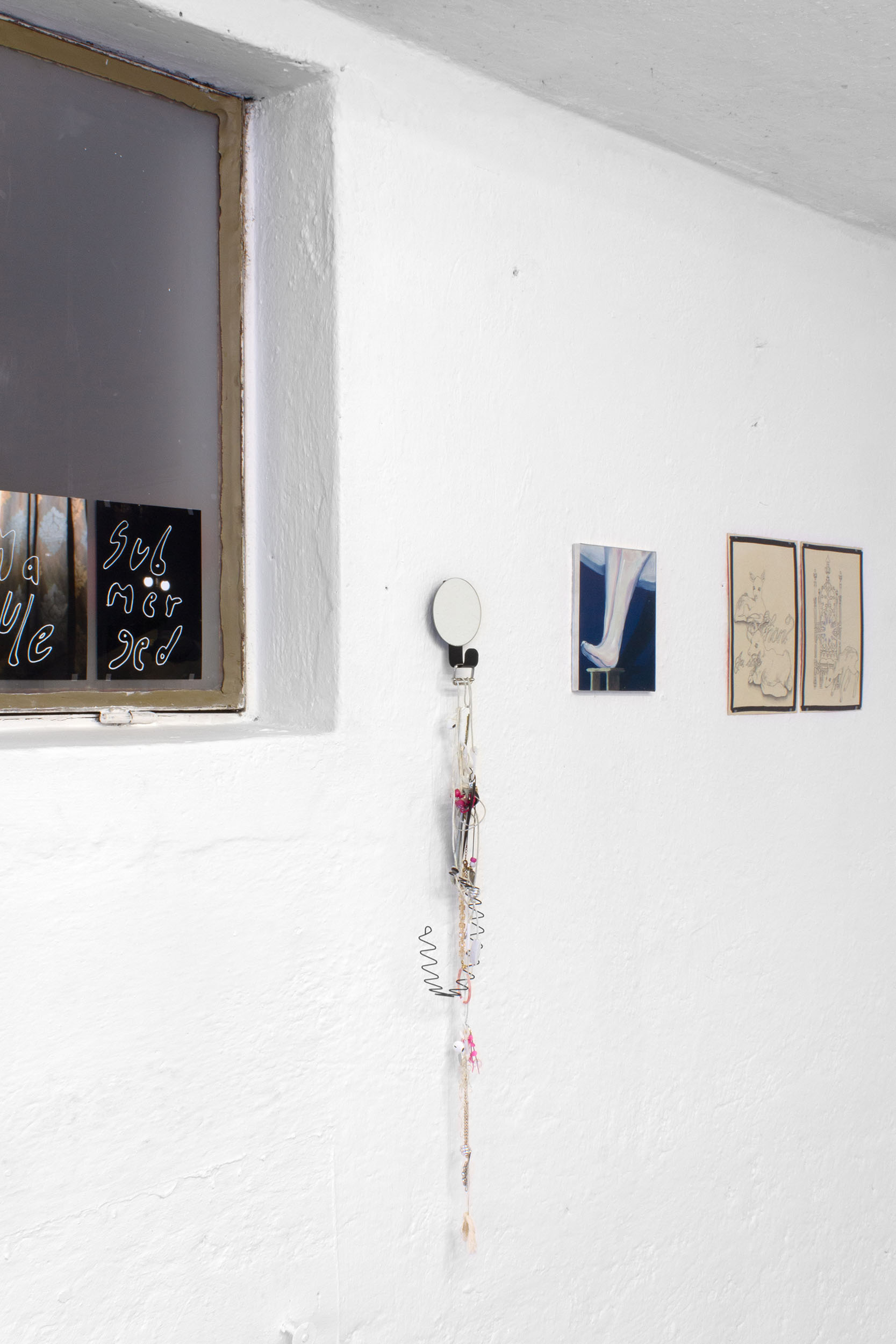Jonas Morgenthaler, Hope, 2024, bathroom mirror with hook, belt slider, found headphones, hair elastic with plastic hearts, necklace with heart pendant, hair clips, remnants of a cord, earrings, found hair ring, found comb, ring, glass bead necklace, metal and plastic beads, cable ties