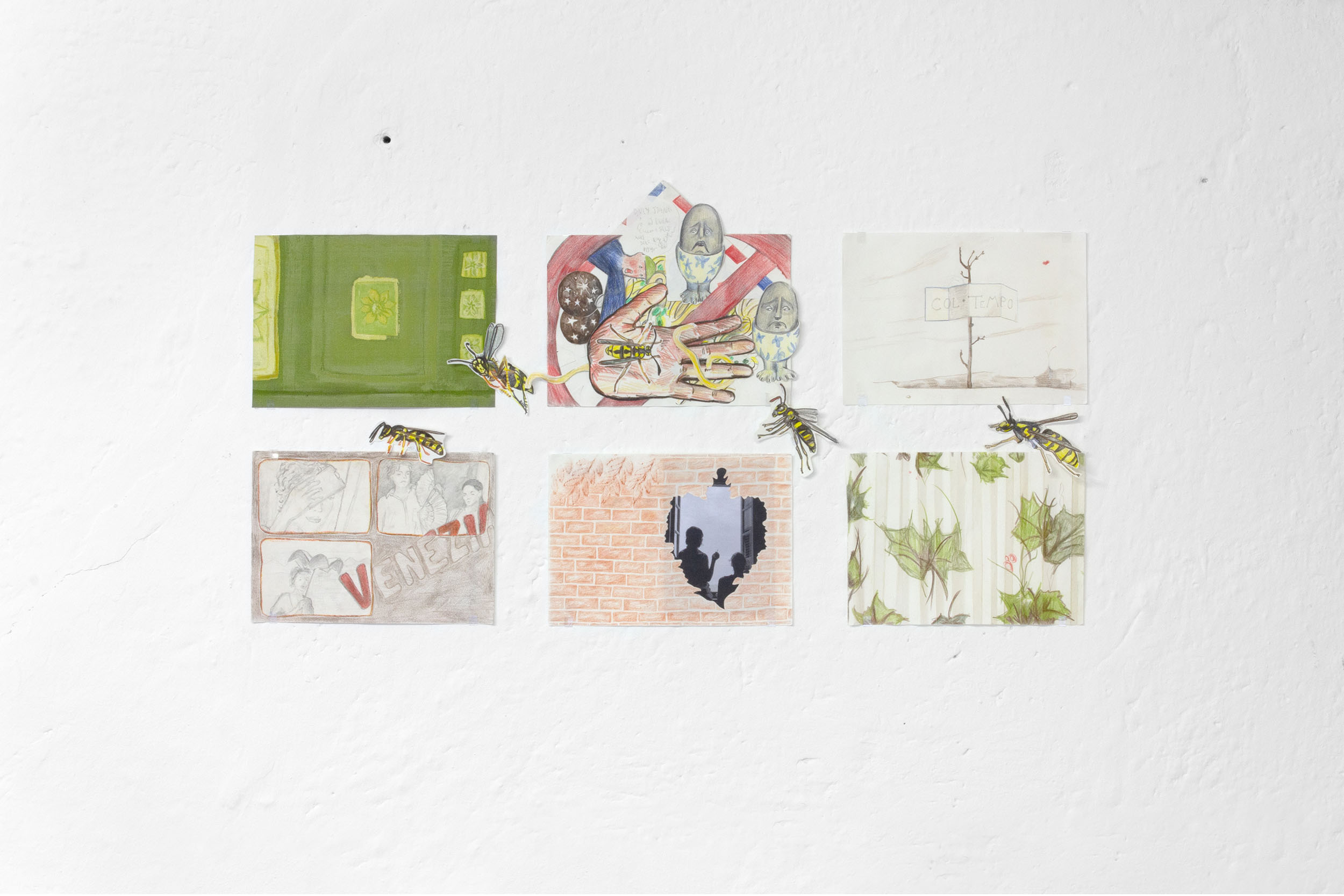 Paula Breuer, Kaja Krebs, Lars Unkenholz, Devi Sund Rojo, Marlene Kargl & Marie Lempelius. The presence of the future past, liebe grüße aus Venedig, 2024, collage of 6 drawings
