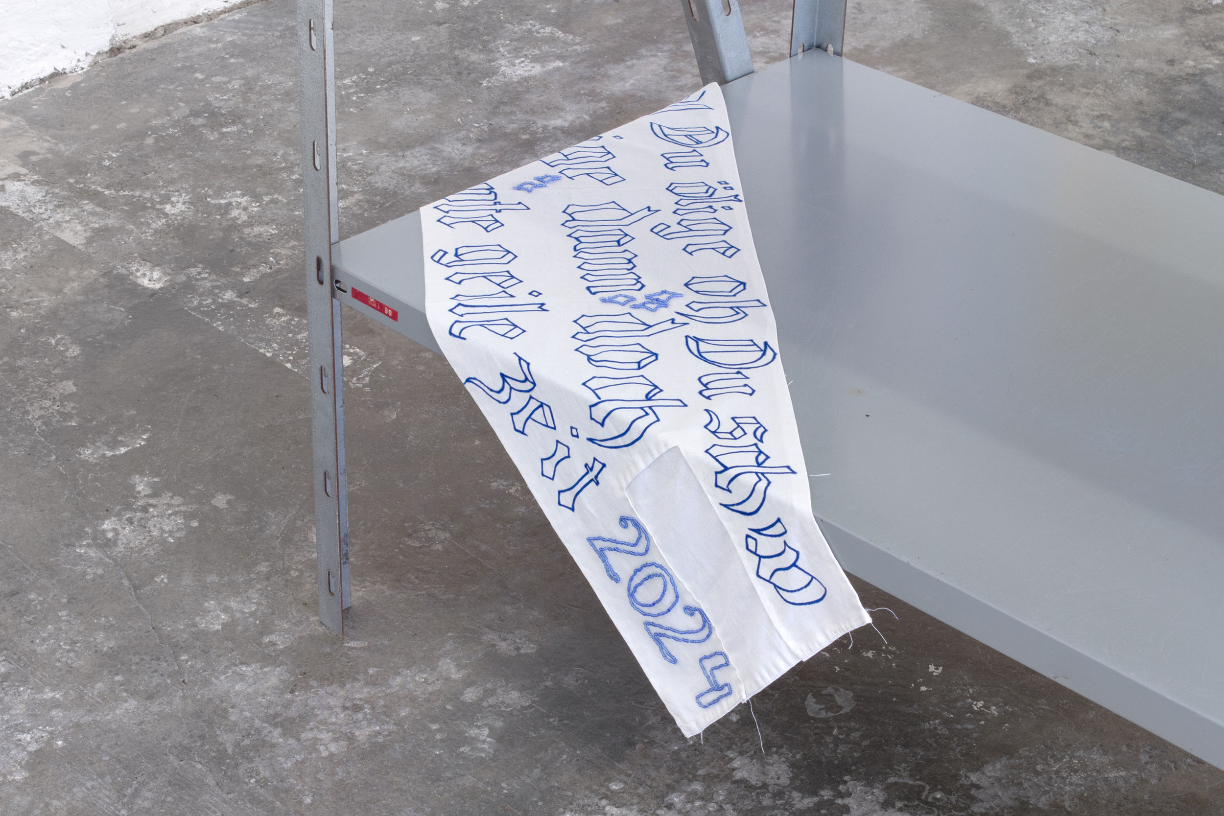Marie Willfort, Zeiten ändern sich, 2024, fabric, Edding 3000, beads